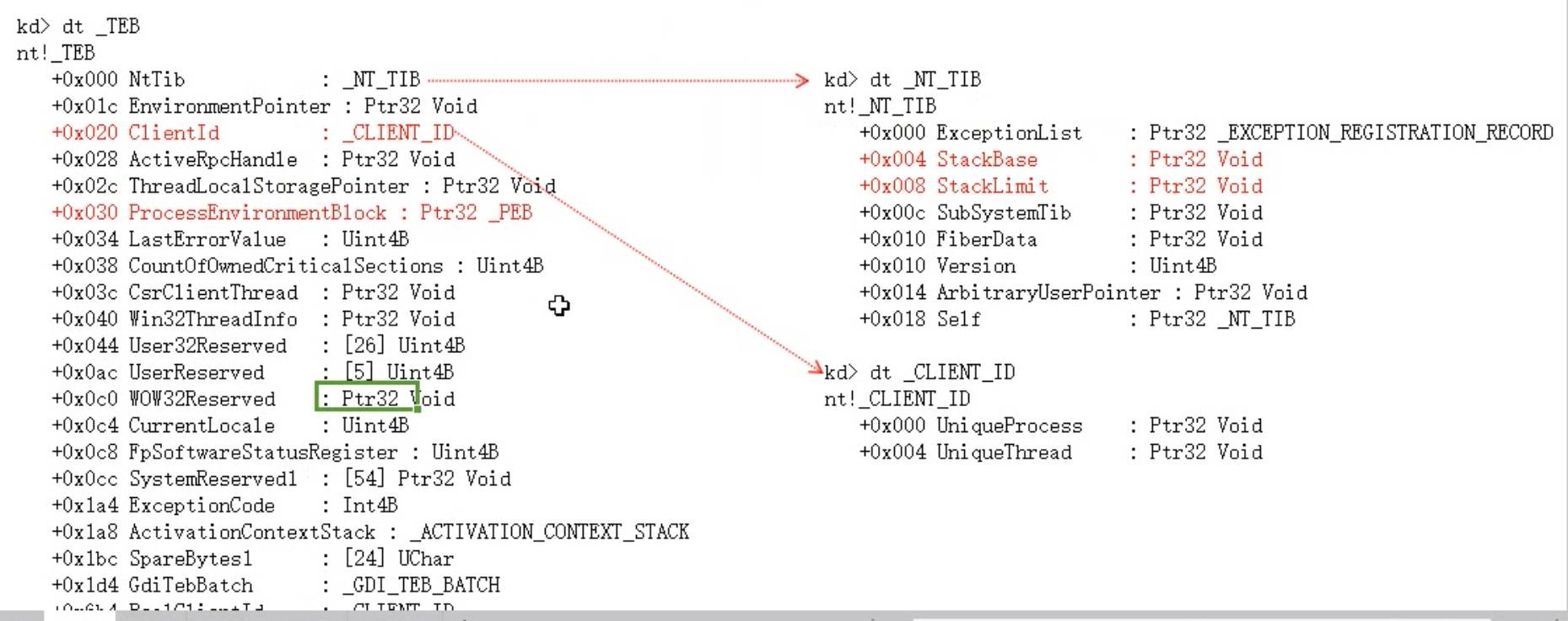 段寄存器fs中记录了TEB的存储位置