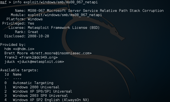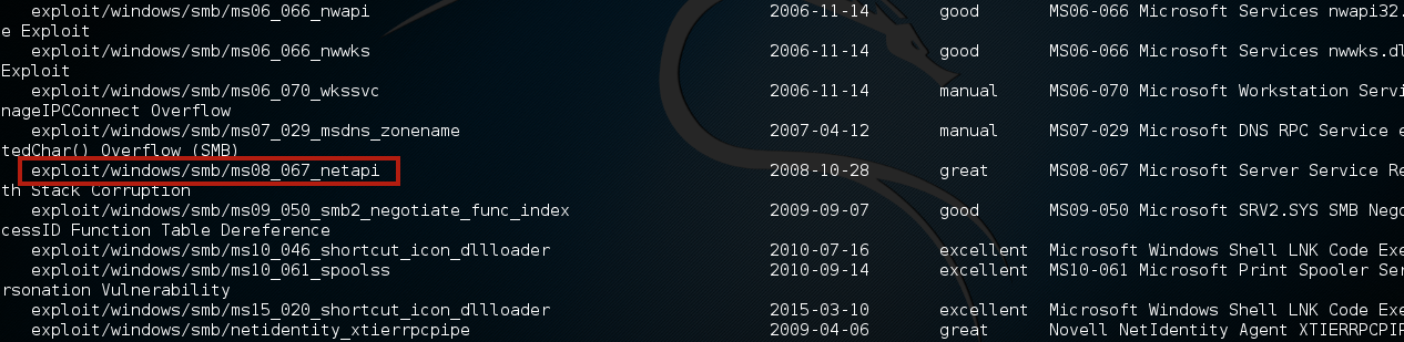 exploit/windows/smb/ms08_067_netapi是08年发现的漏洞,等级Great。