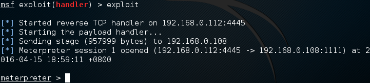 [*] Meterpreter session 1 opened (192.168.0.1:41614 -> 192.168.0.108:4444) at 2016-04-15 17:29:32