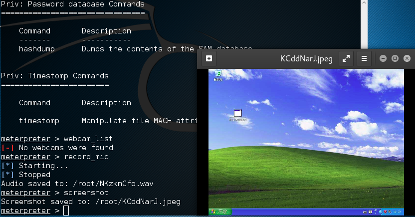 现在你就可以控制目标主机了,可以截屏、录音、视频、下载文件、杀进程等等;使用help查看可以执行的命令。